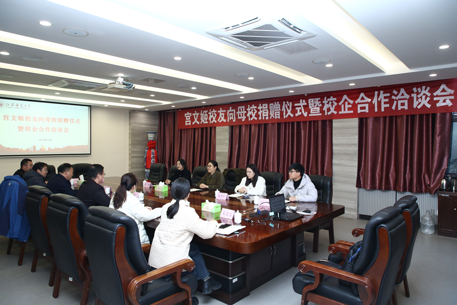 12月5日,宫文姬校友向母校捐赠仪式暨校企合作洽谈会在3号楼402会议室举行。江苏海文农业发展有限公司董事长宫文姬校友一行,校党委常委、副校长商亮,校有关职能部门和学院的相关负责同志参加活动。