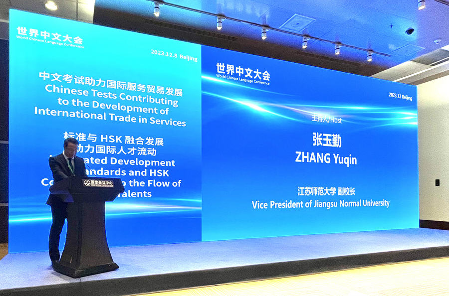 12月6-9日,2023年世界中文大会在北京国家会议中心举行。我校副校长张玉勤应邀出席世界中文大会“中文考试助力国际服务贸易发展论坛”,并担任“议题4:《国际中文教师证书》考试(CTC)服务中文教师培养与发展”的主持人。来自中国、美国、马达加斯加、新西兰、韩国、新加坡、法国等国的嘉宾,围绕CTC考试服务中文教师培养与发展展开讨论。中外与会学者结合自己所在国家和地区的实际情况对国际中文教师的培养与海外对接、CTC考试的推广与发展案例经验进行了详细的介绍,也有学者从项目创新、课程研发、标准建设等不同角度就本土中文教师的在地化培养提出了切实建议。