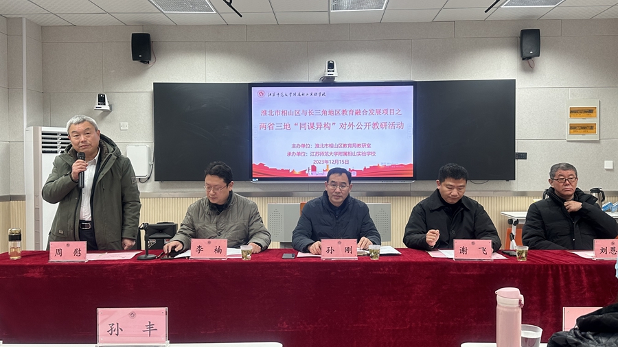 为贯彻落实新课标要求,推动区域教育发展,促进优势互补和智慧共享,助力教师共同发展,12月15日,江苏师范大学附属相山实验学校举行“聚焦核心素养,打造灵动课堂”——两省三地“同课异构”对外公开教研活动暨淮北市相山区与长三角地区教育融合发展论坛。淮北市相山区教育局党委书记、局长孙刚、淮北市教育局教研室主任谢飞、淮北市相山区教育局党委委员、淮北市太阳城学校校长孙丰、淮北市相山区教育局教研室主任丁正文、江苏师范大学附属学校总校校长周慰、总校督学吴健等出席活动。
