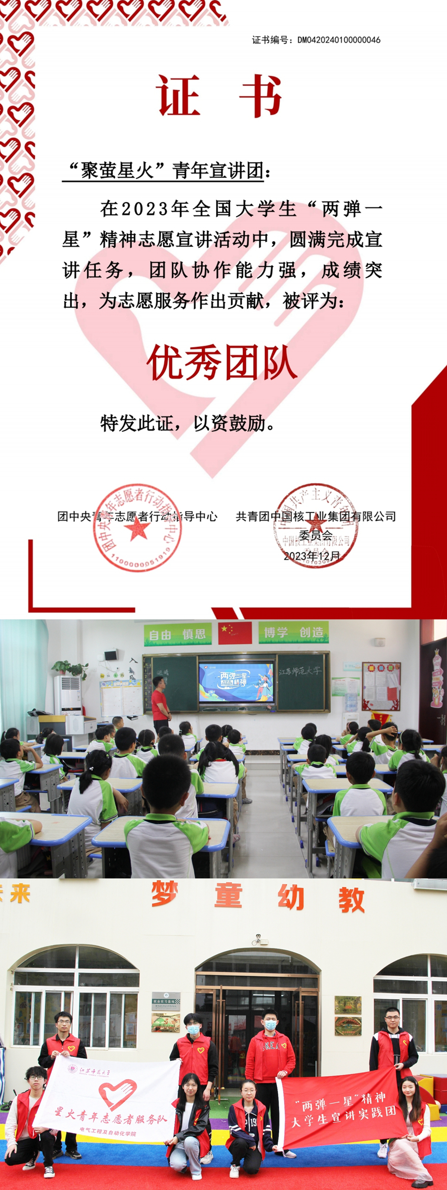 近期,团中央青年志愿者行动指导中心、中国青年志愿者协会等部门发布了2023年大学生志愿宣讲团系列活动评选结果,经过组织宣讲、提交报告、成果评审等环节,我校语言科学与艺术学院“红磐青年”志愿宣讲团、电气工程及自动化学院“聚萤星火”青年志愿宣讲团从1000支专题立项团队中脱颖而出,分别荣获全国大学生井冈山精神志愿宣讲团优秀团队、“两弹一星”精神宣讲团优秀团队。