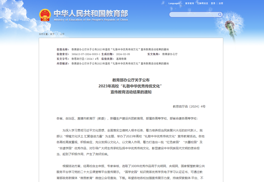 2023年高校“礼敬中华优秀传统文化”宣传教育活动由教育部思想政治工作司主办,以“根植文化沃土汇聚奋进力量”为主题,分为“国学史园”知识竞答、“红色家园”视频展览、“水墨校园”绘画联播、“非遗学园”技艺比拼四项活动内容,旨在深入挖掘中华优秀传统文化价值内涵,推动中华优秀传统文化创造性转化、创新性发展,以马克思主义中国化时代化最新成果激发中华优秀传统文化的生机与活力,用社会主义核心价值观铸魂育人,浓厚校园文化氛围,增强校园文化活力,着力培养担当民族复兴大任的时代新人。