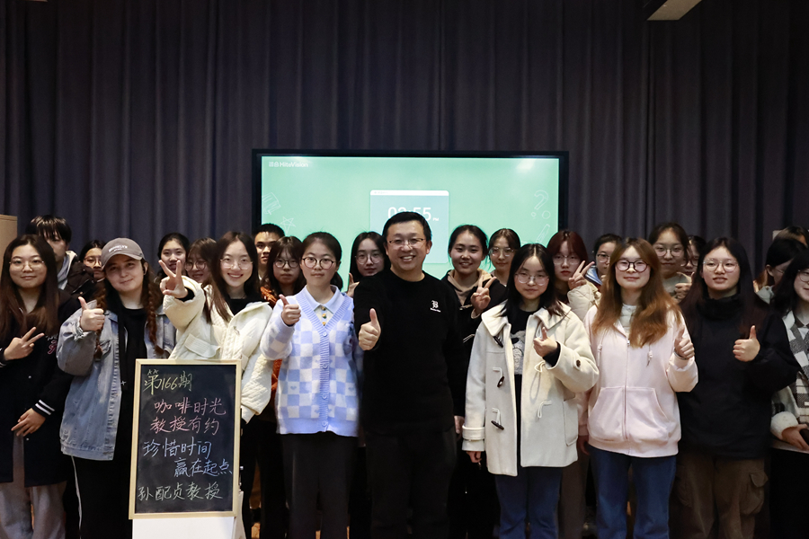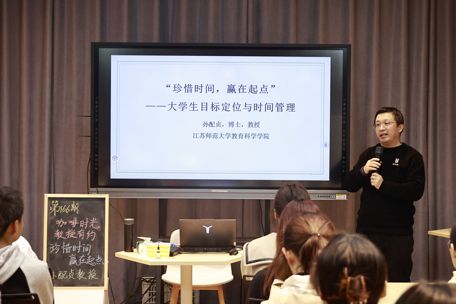 3月28日,第166期“咖啡时光·教授有约”活动在泉山校区园丁餐厅外六点汇实践基地举行。孙配贞教授就“珍惜时间,赢在起点——大学生目标定位与时间管理”这一主题与同学们进行了交流。