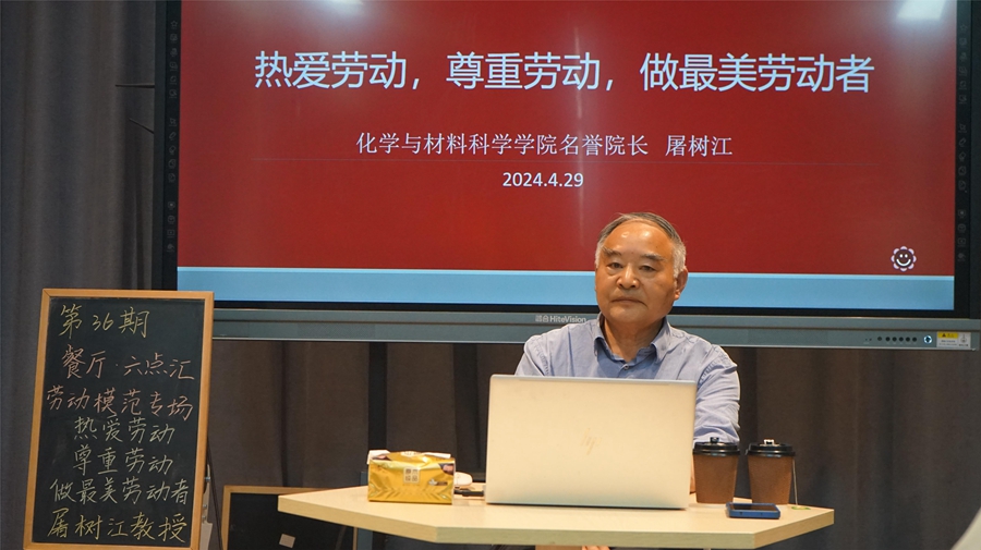 4月29日下午,第36期“餐厅·六点汇”劳动模范专场活动在泉山校区“餐厅·六点汇”实践基地举行。化学与材料科学学院名誉院长、全国五一劳动奖章获得者屠树江教授就“热爱劳动,尊重劳动,做最美劳动者”这一主题与同学们进行交流。