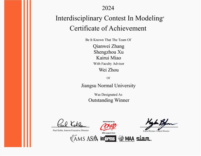 近日,2024年美国大学生数学建模竞赛(MCM/ICM)成绩公布,由我校物理与电子工程学院周伟老师指导,物理与电子工程学院张倩玮(22物12)、徐圣洲(22物12)和苗凯瑞(22物11)三名本科生组成的团队斩获国际特等奖(Outstanding Winner)(大赛共评出35个Outstanding Winner奖,获奖率仅为0.12%。),这是我校首次获得最高奖项,刷新了获奖记录。