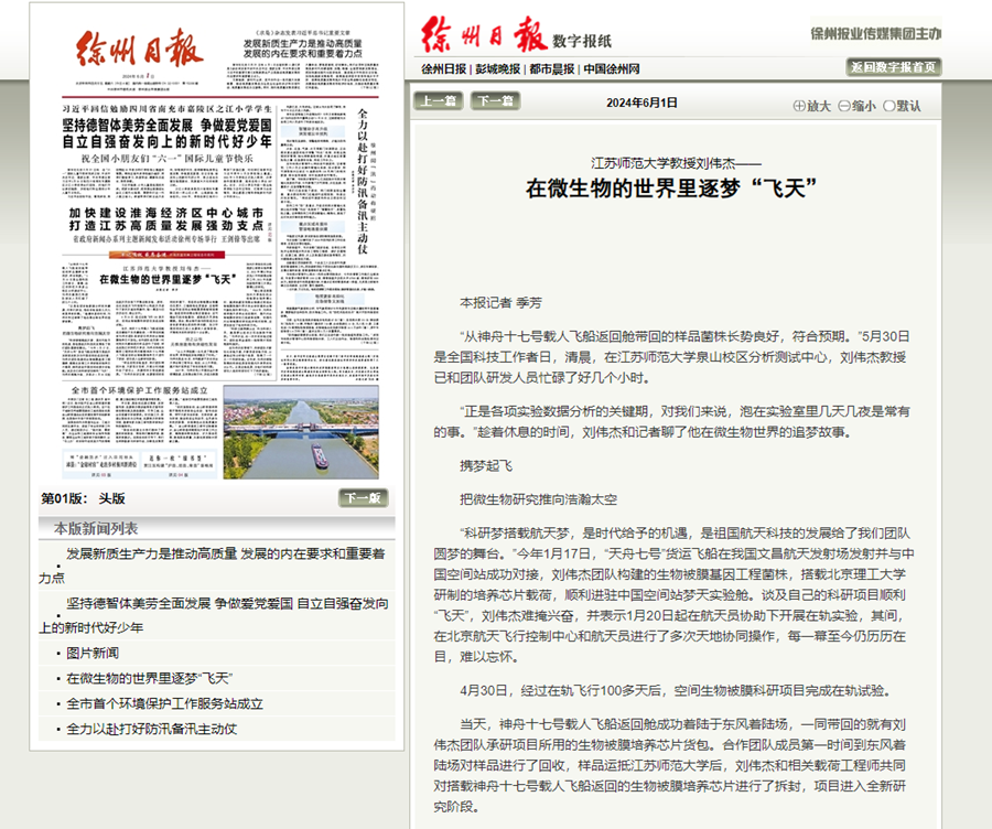徐州日报6月1日报道我校刘伟杰教授团队科研成果,报道内容如下: