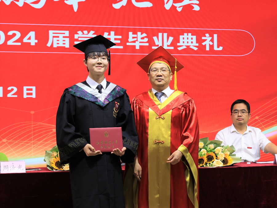 周汝光在典礼上讲话,代表学校向圆满完成学业的敬文毕业生表示热烈祝贺,向共同培养毕业生的7所专业学院致以衷心感谢,向辛勤培育毕业生成长的父母、老师表达诚挚敬意。周汝光在致辞中肯定了敬文学子在专业学习、科研创新、志愿服务、社会实践上的显著成就,同时勉励同学们,要厚植家国情怀,胸怀天下,忠诚担当;要锤炼意志品格,坚定信念,勇往直前;要永葆进取之心,燃烧青春,追求卓越。他希望同学们争做可堪大任的卓越人才,在为祖国、为人民、为民族的奉献中彰显青春担当。
