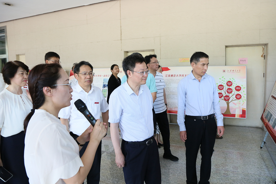 调研组在静远楼大厅驻足观看了专题展板,包括学校统战工作概况、民主党派概况、支持党派成员履职举措及成效、同心教育实践基地建设情况等。