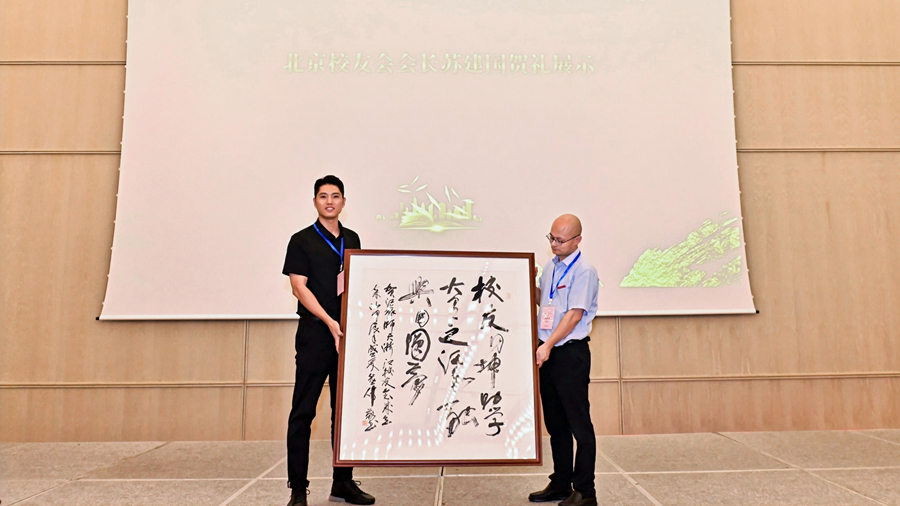 1983级校友、盐城校友会会长吴德东代表母校地方校友会热烈祝贺浙江校友会成立,表示母校各兄弟校友会愿与浙江校友会加强交流,携手并进,共同发展。西北工业大学杭州校友会常务副会长、杭州哦耶科技有限公司董事长邓方涛代表兄弟高校校友会表示愿与江苏师大浙江校友会加强互动,增进友谊。曹明富对江苏师大浙江校友会成立表示祝贺,期待新成立的江苏师范大学浙江校友会积极发挥桥梁纽带作用,整合校友资源,实现优势互补,助推校友经济,共同促进校友、学校与地方经济社会发展。成立大会上,宣读了兄弟高校和母校地方校友会贺信,播放了祝福视频,北京校友会赠送了由1989级校友、中国书法家协会理事、原荣宝斋出版社社长崔伟题写的“校友同坤,助学大有,之江和融,兴国圆梦”书法作品。