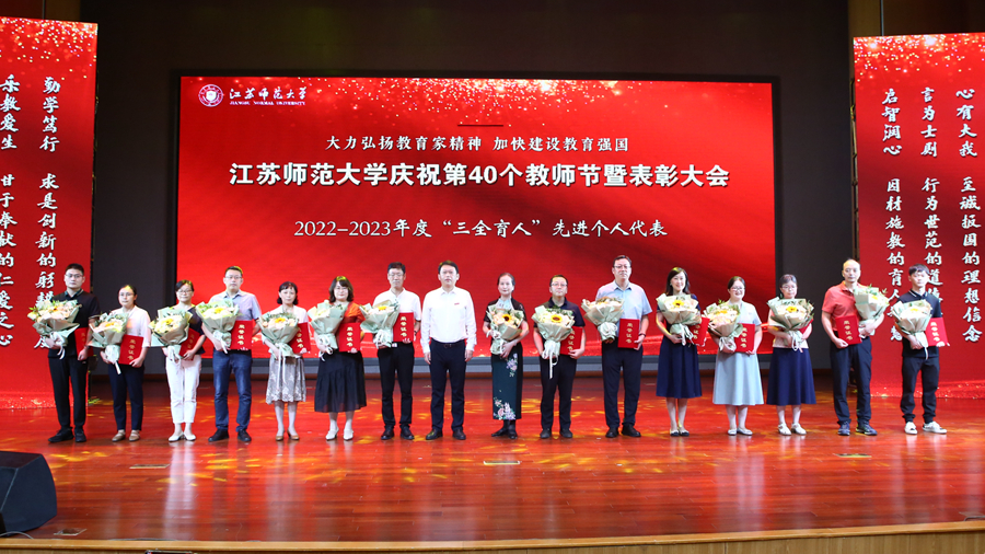 校党委书记方忠在表彰大会上致辞,代表学校党政向全校教师和奋战在教育教学一线和管理服务岗位的教职员工致以崇高的敬意和节日的问候,向全体新入职的教职工们表示热烈的欢迎。他指出,2023年教师节前夕,习近平总书记致信全国优秀教师代表时提出了中国特有的教育家精神,为新时代教师队伍建设指明了前进方向、提供了根本遵循。党的二十届三中全会对进一步全面深化改革推进中国式现代化进行了系统擘画,提出“教育、科技、人才是中国式现代化的基础性、战略性支撑”,并对深化教育综合改革作出部署。方忠勉励全体教职工,要坚定信念,涵养高尚情操,强化“师德”之本;要以生为本,潜心教书育人,恪守“人师”之道;要求是创新,练就过硬本领,筑牢“强师”之基。他希望广大教师深刻领会高校作为教育、科技、人才重要结合点的基础性、战略性支撑作用,进一步聚焦我校“特色鲜明、国内一流、国际知名的高水平师范大学”建设目标,凝心聚力擘画奋进蓝图,团结一致推动高质量发展,为中国式现代化的宏伟事业贡献江苏师范大学的力量。
