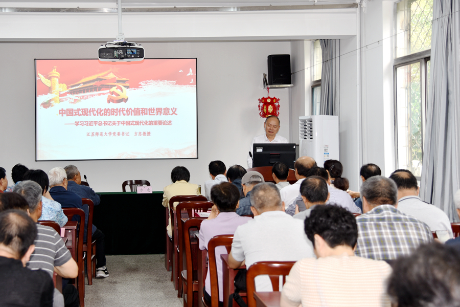 方忠在报告中介绍了中国式现代化的鲜明特征、历史内涵和世界意义。他表示,当前是全面推进强国建设和民族复兴的关键时期,中国式现代化将在改革开放中不断发展,展现出鲜明的国别特征和时代价值。中国式现代化走和平发展道路,致力于构建人类命运共同体,践行全球共同价值,推动经济全球化与多极化。中华民族历来推崇“天下大同”的理念,今天更是致力于建设持久和平与共同繁荣的世界。报告特别指出教育建设中国特色社会主义现代化强国中的重要性。方忠强调,锚定2035年建成教育强国的战略目标,我们要把思想和行动统一到二十届三中全会精神和党中央决策部署上来,统一到习近平总书记关于教育工作的一系列重要讲话精神上来,真抓实干、奋力前行,为推进中国式现代化建设提供坚强支撑。希望退休党委的老党员们,以丰富的经验和智慧,在学校的教育改革中持续发挥着重要作用。