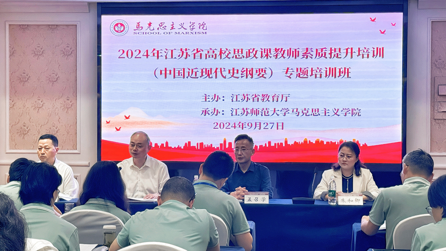 近日,由江苏省教育厅主办、江苏师范大学马克思主义学院承办的2024年江苏省高校思政课教师(中国近现代史纲要)专题培训班在我校举行。校党委书记方忠、校党委宣传部部长孟召学和马克思主义学院相关领导出席了开班仪式。来自江苏省38所高校的50名思政课教师参加了此次培训班。