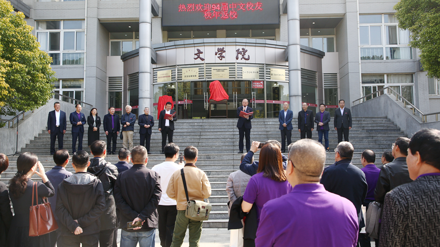 10月26日,我校在西教11号楼前举行文学院院史馆揭牌暨1994届中文校友捐赠仪式。校党委书记方忠、中文系教师代表徐放鸣、寇立光、赵兴勤、吴建民、张淑美,校盐城校友会会长、中文83级校友吴德东,校苏州校友会会长、中文98级校友王建波,中文94届参加秩年返校活动的全体校友出席活动。