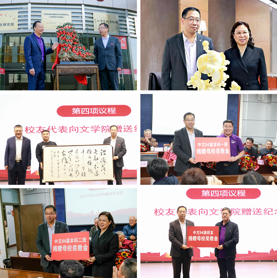 仪式上,中文94届任课教师代表方忠、徐放鸣和中文94届校友代表李文林、胡忠秀、陈硕共同为院史馆揭牌。李凤亮校友代表中文90(1)班向学院捐赠了寓意人才培养硕果累累的石湾荔枝陶塑,胡忠秀校友代表中文90(2)班向学院捐赠了寓意鱼跃龙门、蒸蒸日上的工艺品,陈硕校友代表中文92专科班向学院捐赠了嵌藏学院院训的原创诗歌、书法艺术作品,校友们还分别以班级、年级为单位认捐了学校的校友林,并向学院捐赠了奖教金。文学院向每位校友回赠了精心设计的文创纪念品。仪式结束后,校友们在讲解人员引导下,逐一参观了院史文化墙、院史资料珍藏馆、新时代文学研究中心、中国乡村志文化研究中心等文学院展馆群,并在下午举行了气氛热烈的师生见面会。