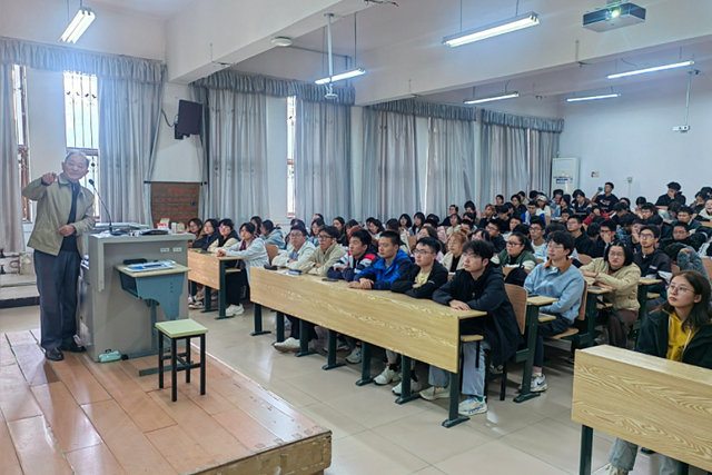 10月23日下午,原数学系主任、校老年科协原秘书长、校关工委讲师团原理科组组长戴朝寿教授应邀为数学与统计学院2024级新生作了题为“让青春在大学阶段踏踏实实有意义地度过”的专题讲座。戴教授系统阐述了数学在现代科学技术中的重要地位,并从确立好世界观、人生观、价值观等方面提出了具体要求。他鼓励同学们牢记“勤可补拙,静能生慧”,早立目标、做好规划,善于思考、培养灵气,坚守初心、脚踏实地。戴教授的报告蕴含了详实的历史史料和丰富的教学经验,深入浅出、通俗易懂,赢得了同学们的一致好评。最后,他以一曲《世界是你们的》引发了同学们的阵阵掌声和强烈共鸣。