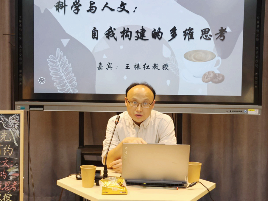 王振红以自己求学任职的经历引入,分别与同学们交流“科学的定义”,他结合同学们的回答进一步说明了“科学”在生活中的应用,他同时推荐阅读吴国盛教授的《什么是科学》,从而更好地了解“科学”。他通过讲述西方的科技发展史、中西医发展史等内容来说明科学发展是一个不断被推翻与重建的过程,具有无可替代的重要性。他通过“人文”的定义引入“人文”的核心内容“文化”,论证人文精神对中华文化的影响。