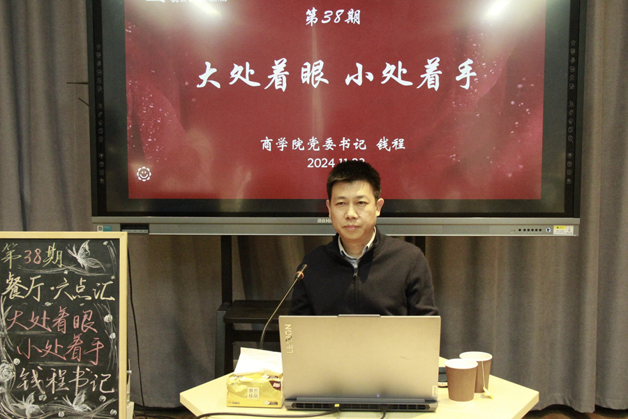 11月23日下午,第38期“餐厅·六点汇”活动在泉山校区“餐厅·六点汇”实践基地举行。商学院党委书记钱程就“大处着眼,小处着手”这一主题与在场同学进行交流。