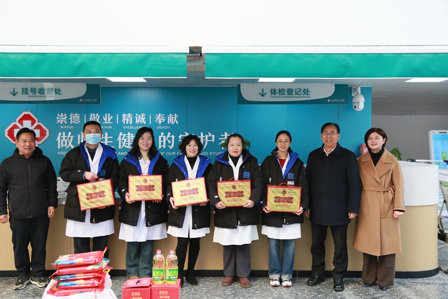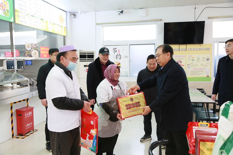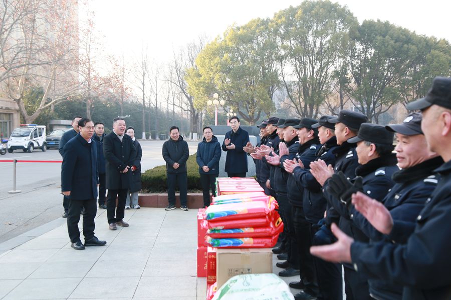 1月29日,乙巳蛇年正月初一,校长杜增吉带队走访慰问春节期间坚守岗位的教职工和寒假留校学生,代表学校向他们致以诚挚问候和新春祝福。校长办公室、工会、后勤管理处、保卫处、后勤集团等单位负责人陪同。